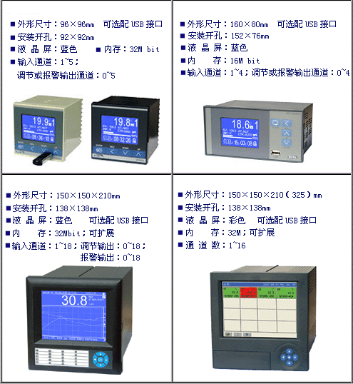 輸出通道:0~18路 顯示方式:長(zhǎng)壽命背光LED,全智能對(duì)比度與亮度調(diào)節(jié)功能,可選藍(lán)屏、彩屏 顯示曲線、棒圖、數(shù)字、混合、歷史、報(bào)警等 內(nèi)置算法:PID,流量累積(包括保和過(guò)熱蒸汽石油天燃?xì)獾劝朔N累積算法) 記錄間隔:1秒~30分 存儲(chǔ)介質(zhì):4~128Mb FLASH 環(huán)境條件:溫度-10~55C;濕度10%~85%RH
